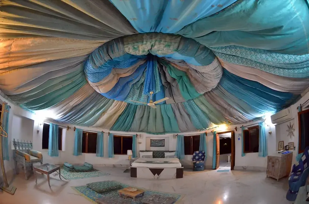 Treat yourself to one of our sumptuous rooms filled with saris and silks. Beautiful tapestries adorn the walls. Regal purple, dramatic chocolate, peaceful turquoise and more represent the Sunrise-Sunset circular rooms where you can sit on your balcony, at your 2nd story window seat or perhaps on an accessible ground floor terrace of a free standing unit. Far reaching views of our beautiful desert await. A real treat.