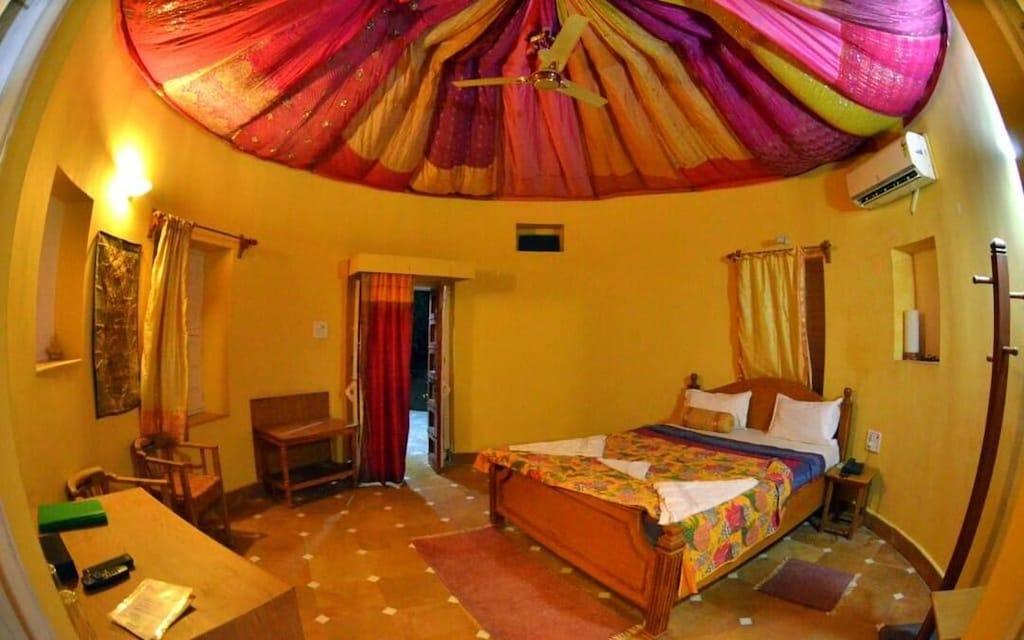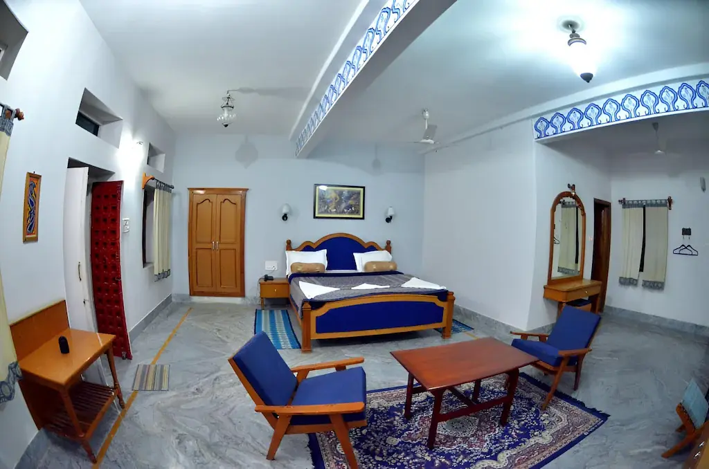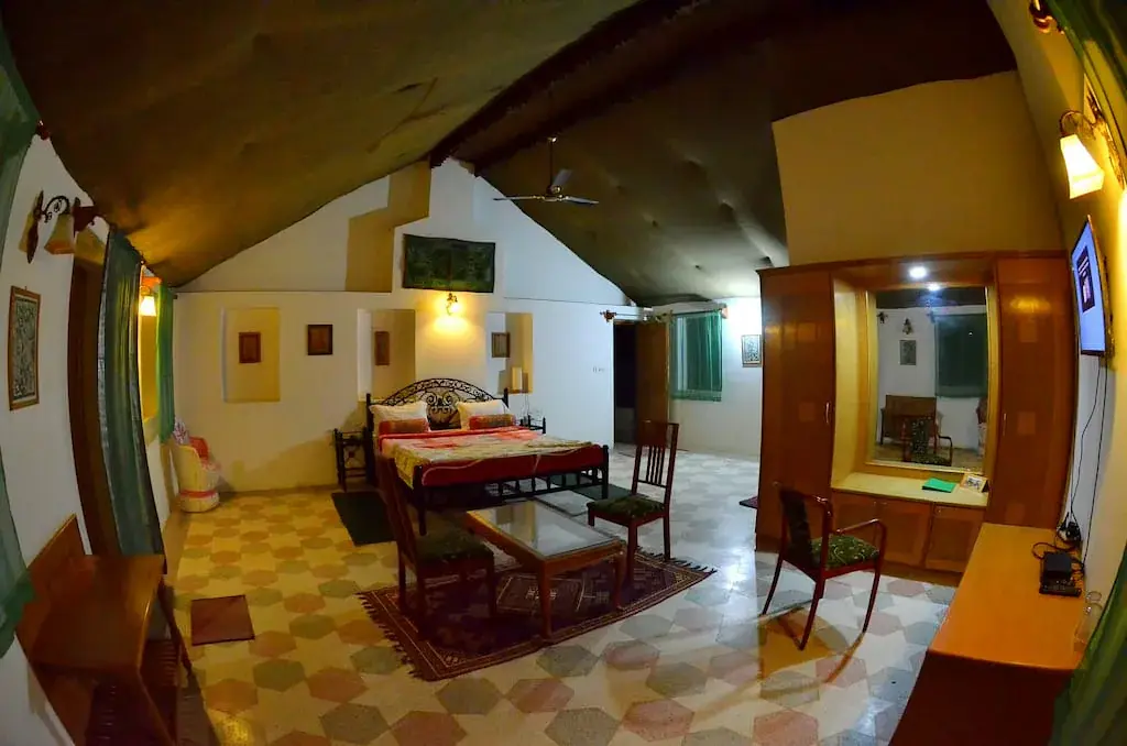 These rooms are clustered in separate 4 room buildings. Great for those wishing to be with larger friend or family groupings. Each has either a ground floor terrace for easy access or upstairs balcony rooms with pleasing desert and interior views. The tapestries and traditional block prints in blues , maroons, orange and yellow round out this comfortable room setting.